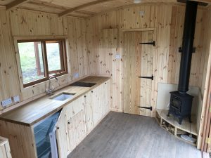 The hut shown below, which is 18ft x 9ft, comes with fitted with kitchen, shower, toilet, wood burning stove, lighting, fully insulated, storage units and double bed.